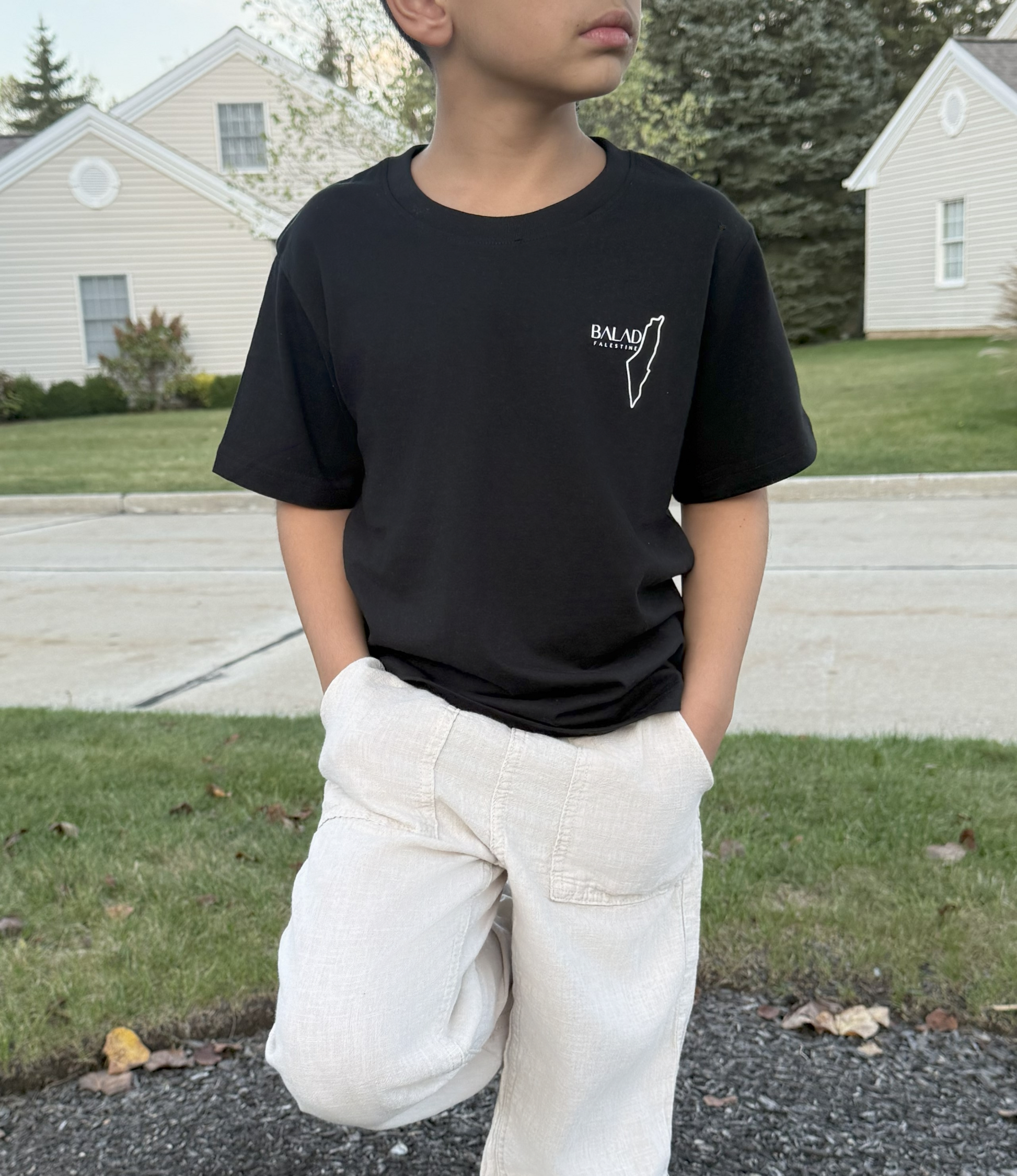 This black tee features a bold olive tree made up of the names of Palestinian cities. This is a tribute to where we come from and who we are.